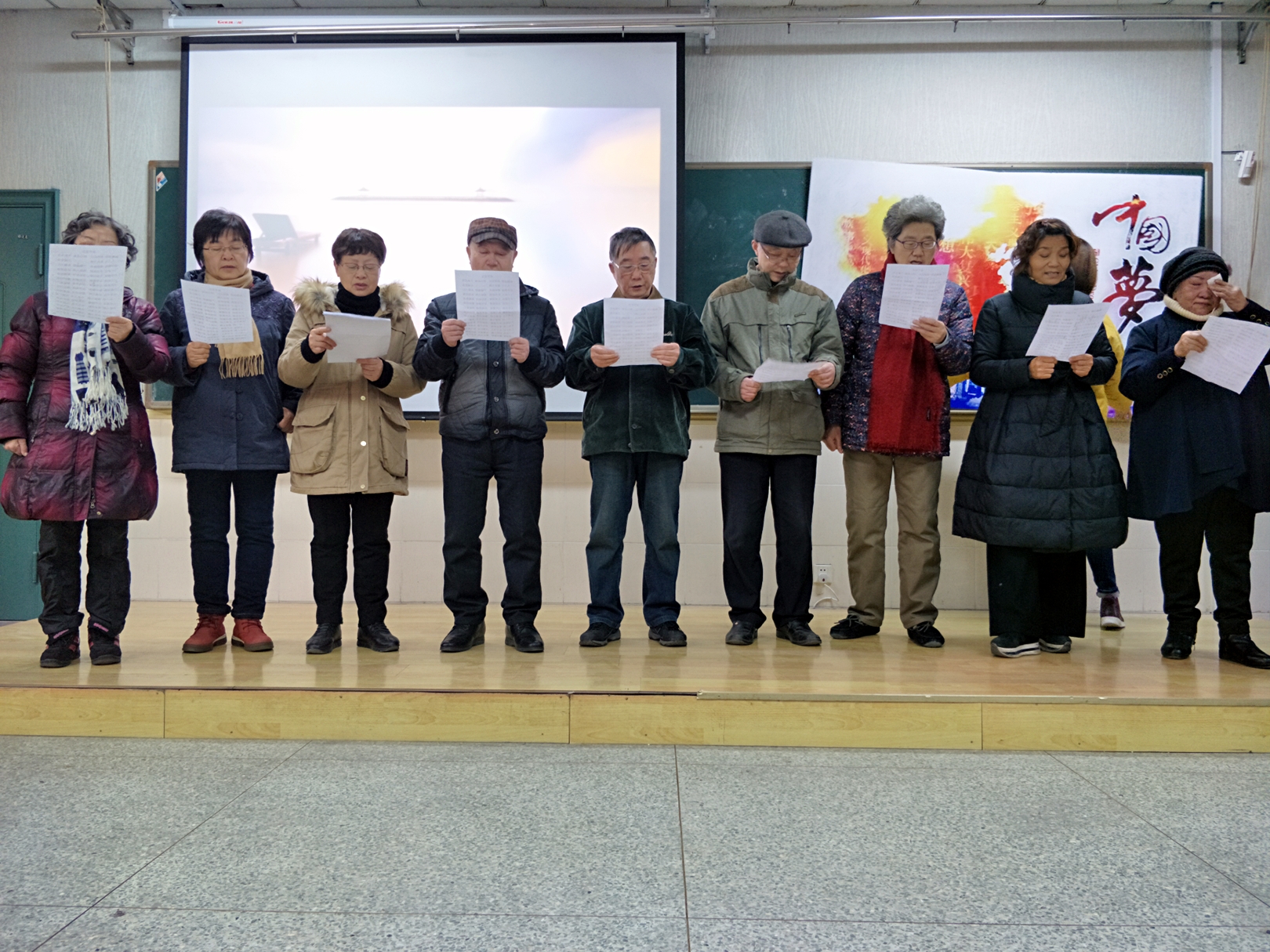 活动伊始,在李亚喆同学的主持下,全体参会人员起立默哀一分钟,为南京大屠杀死难者进行祭奠,会场气氛安宁而凝重。活动第二项是由七家湾社区“乐龄读书会”的老爷爷、老奶奶们为大家朗诵《和平宣言》,老奶奶在读到“烧杀掳掠,血染河山”时哽咽失声,流下了泪水,让人为之动容。我们有幸生在和平年代,在珍惜现在的幸福生活时更不能忘却历史。