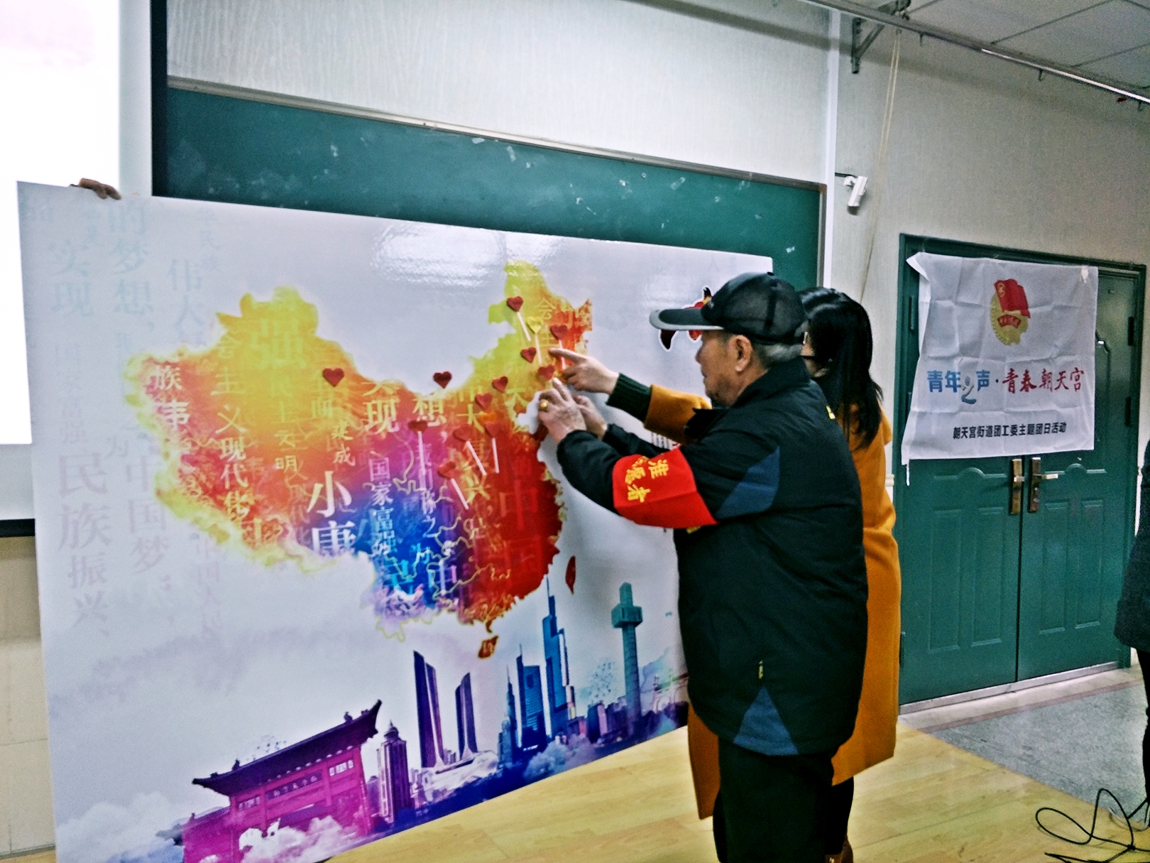 活动接近尾声时,主持人号召大家在爱心折纸上写下自己的梦想与寄语,并将其贴在梦想板的中国地图上,五颜六色的折纸承载着学生多彩的梦想和长辈们对于后辈的美好祝愿,相信这些单纯而真挚的愿景会汇聚成更美丽的中国梦!最后,在主持人的带领下,全场人员起立并发出对革命先辈的追忆与对祖国的深切祝愿,“愿天佑中华,国泰民安!”