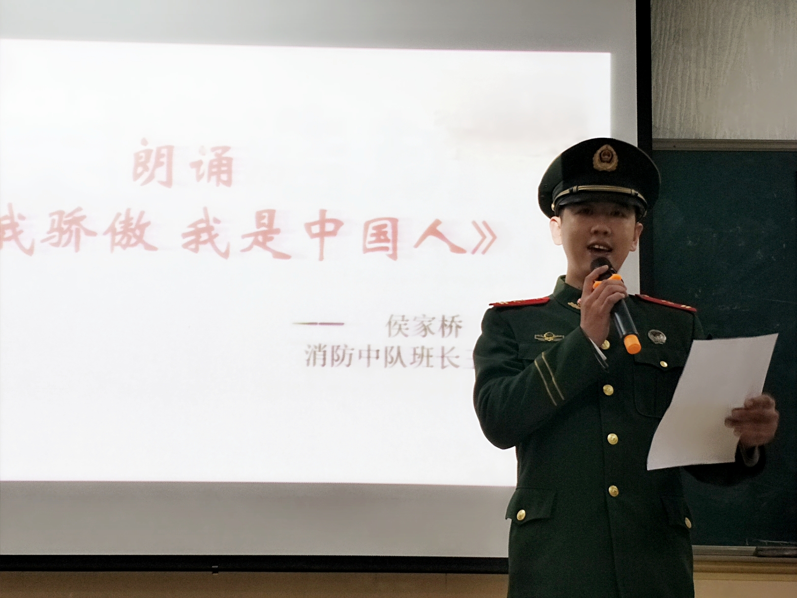 活动第五项,侯家桥消防中队班长王亚伟同志以高昂饱满的精神为大家朗诵了《我骄傲 我是中国人》,一次次“我骄傲,我是中国人”唤起了全场人员强烈的民族自豪感和爱国之情。紧接着朝天宫民族小学一年级的小朋友们用稚嫩、富有朝气的声音朗诵了《我的祖国》,表达了他们对祖国的爱和对未来的憧憬。作为中华民族的炎黄子孙,我们要以实际行动传承和培育民族精神,做国家的栋梁之才,奉献社会,报效祖国。