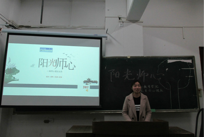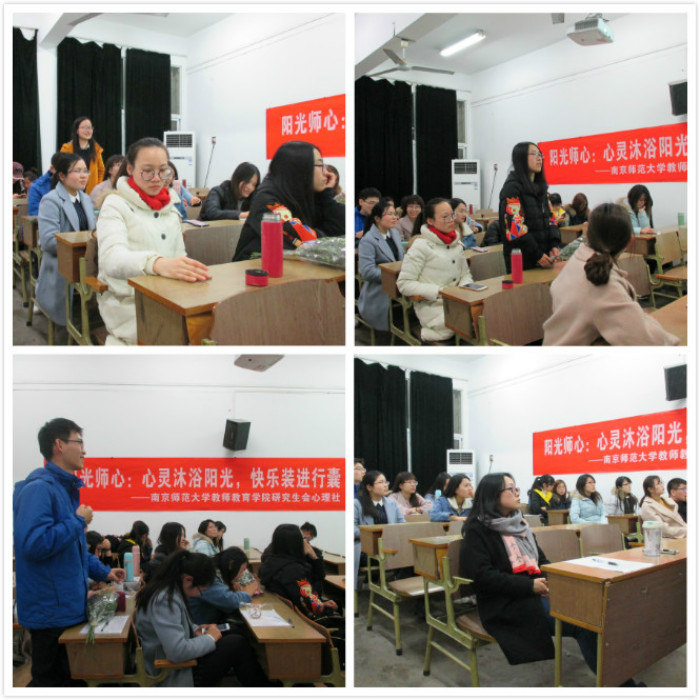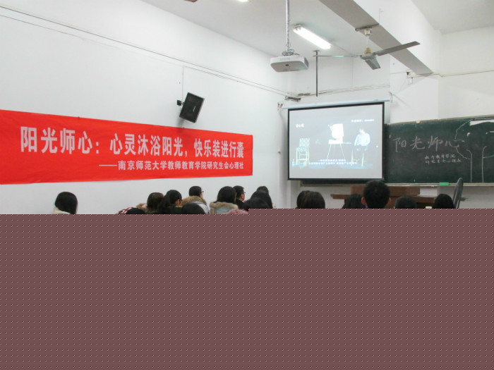 研究生会心理社于3月24日下午6点半在随园校区电教楼112教室开展了以“心灵沐浴阳光,快乐装进行囊”为主题的心理健康活动,活动由心理社成员任美丽主持,研究生会副主席刘琪琳、刘瑛琪,心理社负责人钱吉等三十多名同学共同参与了此次活动。
