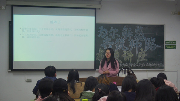 第一场交流会,学科语文教学方向的李允霖从各种文学体裁的兴衰开场,围绕着宋朝三位著名词人的生平、代表作以及词的特点展开了本次妙趣横生的讲座。首先,从亡国君主李煜前半生的醉生梦死和后半生的亡国之痛为对比,生动地论述了李煜词作由繁华到幻灭的脱胎换骨。继而讲到了欧开风气的“小老头”欧阳修以及他平实而毫无造作之气的词作特点,李允霖以幽默的讲演方式,让同学们感受到了他《浣溪沙》、《浪淘沙》、《朝中措》等词平实中的豁达与自然。最后,以悼亡诗《江城子》让我们看到了一个不一样的豪迈派词人苏轼的另一种深情,从词的情感抒发到生命的苍凉性感悟,没有铺陈的怆然意境使在座同学都真切感受到了词的魅力。三位词人、不同的生平经历、不同的词作风格,多首脍炙人口和经典绝美的词作,让宋词的美在此次交流讲座中流转。