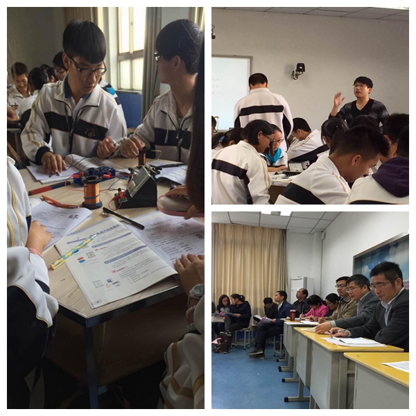 10月27日,在高邮中学物理课程基地,教师院教育硕士生葛腾霄和高邮中学“郭特名师工作室”成员陈云彩老师通过在“教学新手”与“教学专家”之间开展同课异构的创新方式为我们奉献了两堂十分精彩公开课。课题为《探究感应电流产生的条件》。教师院陆建隆教授、江苏省特级物理教师郭如松、高邮市教育局朱林根主任、高邮中学和高邮市的约40名高物理教师共同观摩了这次教研活动。