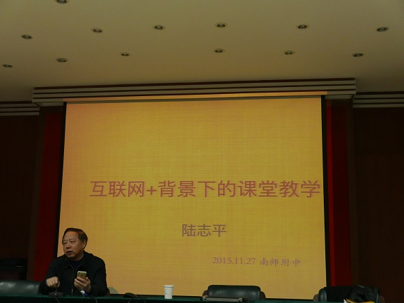 陆志平老师讲座的主题是“互联网+背景下的课堂教学”。首先,他简单介绍了“互联网+”的含义,并从关爱、责任和创造三个层次进行了展开。其次,陆志平老师强调了教育信息化的教育理念和教学模式的深刻革命。过程中,陆志平老师放眼国内外,多次引用经典,诸如联合国教科文组织教育与人力发展部主任查韦斯教授的著作《教育与创新》,乔布斯之问,习近平主席致信国际教育信息化大会内容等等,从而使在座各位更加理解教育信息化带来的深刻革命。最后,陆老师以翻转课堂在中国本土化的实践为例,从结构,时空关系,教学目标,评价四个方面对“互联网+”时代相比传统教学的相关内容进行了深入浅出的讲解。