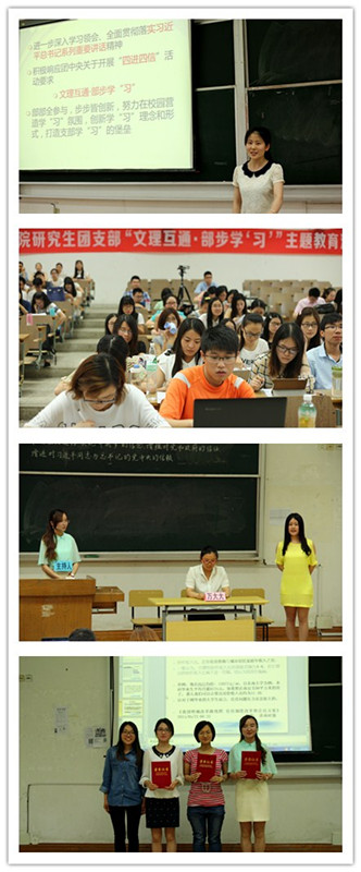 14级研究生团总支组织了以学习习近平总书记系列重要讲话精神为主题的团日活动,本活动以微课为载体,对习近平总书记的“四进四信”进行领会和宣传,在支部内部形成良好的学习风气,同时促进支部团员的学习和交流,增强支部的核心竞争力和凝聚力,以便以后在学习生活中更深入贯彻习近平总书记重要讲话精神。文科团支部、理科团支部及三年制团支部的全体同学积极参与,活动由文科班团支书刘颖同学主持。此次团日活动旨在为学生提供文理互通的平台,十大专业的代表队结合自身专业特色,展示微课内容,并现场进行录制,最终通过20位评审团打分评选出一等奖3名、二等奖3名以及三等奖4名。