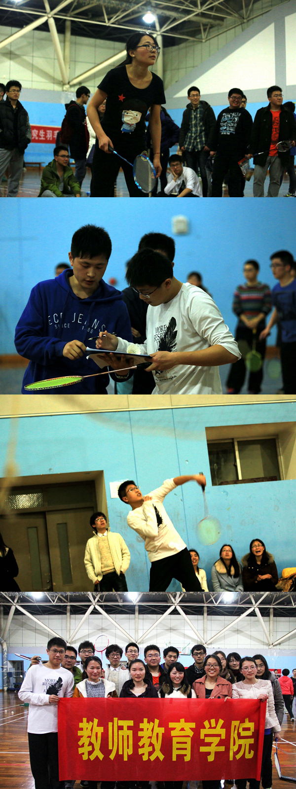 首场的男单比赛,教师院葛腾霄同学一路领先,以11比5的优异战绩交换场地后,在对方球员越拼越勇的情况下稳住阵脚,最后以一计精彩杀球拿下赛点,为首场比赛开了一个好头。接下来进行的女单比赛上场的是女将鲍静同学。开局比分胶着,在场边啦啦队的加油助威下,她很快调整状态、冷静分析,抓住对方失误,稳步得分,以21比5的大比分再拿下一城。最后的男双比赛,双方势均力敌,当比分交替上升时,葛腾霄和孙风波同学抓住赛间空隙,制定战略,互相协助,连拿7分锁定胜局。就此黄色视频