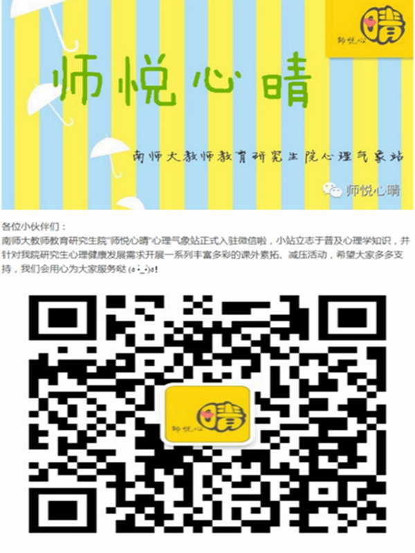 研究生“师悦心晴”心理气象站为更好地服务同学,开通了公共微信,微信号为:nnusyxq。“师悦心晴”心理气象站利用微信平台宣传心理学知识,引导本院研究生以积极的心态应对挫折和挑战,为研究生全面、和谐的发展提供保证。