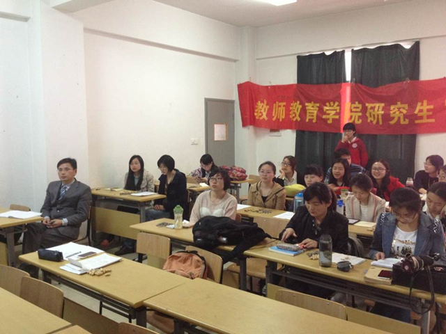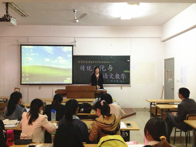 活动在李琳同学的主持下拉开序幕。首先登台发言的是张一帜同学,她将成语中的字词解释与中学文言文教学相联系,提出了一条独特的文言教学方法,使其他同学得到启发。随后演讲的是徐菡同学,她就当下语文教学现状提出了自己的看法,认为语文教学程序化是现在存在的主要问题,并且将会引发学生自我与精神的分离、标准化的文本解读以及评价方式僵化等很多教学问题,随后,她从老子的“无为”思想出发,认为未来的语文教学中应给学生提供多种多样的素材供学生自由选择,教师的职责是为学生“推开一扇风景的窗子”。徐菡的发言由浅入深、与时俱进,获得同学们的一致好评。活动渐入佳境,同学们踊跃发言,现场氛围热闹且和谐。紧接着,夏帅波同学向大家介绍了传统文化中名、字、号的使用方法,兼具趣味性与实用性。最后上台的是陈海洁同学,她演讲的主题是饮食文化与语文教学,首先介绍的是酒文化在语文学科中的广泛应用,讲述了酒在古代人的精神生活和情感生活的亲密关系、酒中所积淀的中国古代文化以及语文教学过程中对酒文化阐释的残缺与不足,除了文字介绍,她还为同学们展示了相关图片,图文结合使大家对传统文化的理解更深一层。此外,陈海洁还例举出三种教学方法,即“美食推荐”、“小试牛刀亲下厨”、“自取菜名”,从情景教学的角度将美食文化与语文教学进行了完美结合。