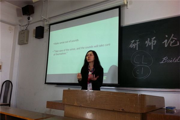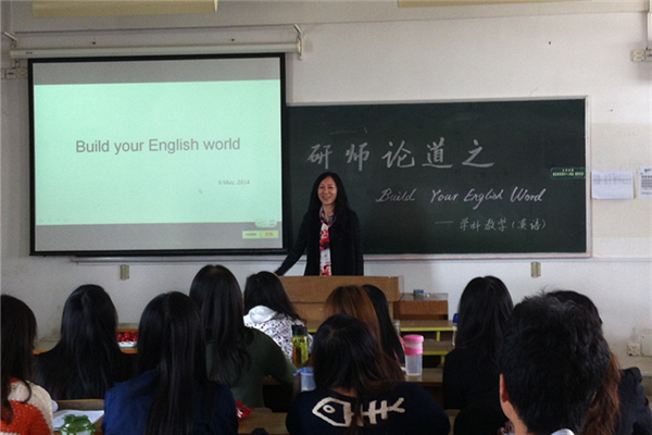 在谈到教学的艺术时,田老师引用了中国古代学者孔子的名言:“知之者不如好之者,好之者不如乐之者。” 她认为一个好的教师必须首先是热爱教学的,乐于学习的。教师应不断学习,提高自我。又以William Arthur ward的一段话:“The mediocre teacher tells. The good teacher explains. The superior teacher demonstrates. The great teacher inspires.”结尾,希望在座同学懂得在教学中激励学生。