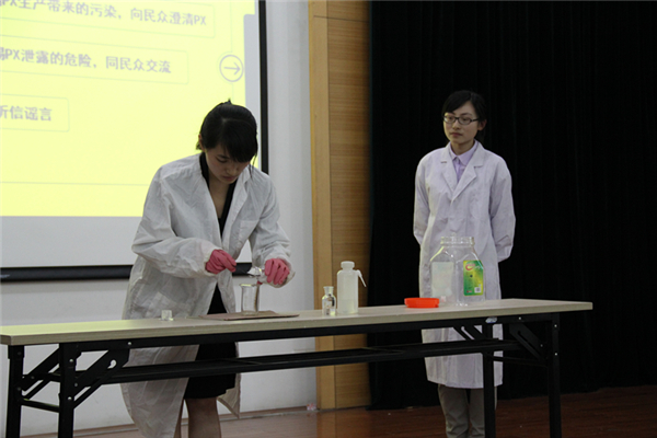 一番轻松愉悦之后,话题聚焦社会热点问题。教科院胡蕾同学的微学术主题是《父亲缺位对子女教育的影响》,父母家庭角色对子女在人格完善、认知发展和社会交往等方面都产生潜移默化的影响。最后两位选手也各具特色,教师院化学方向的张婷同学现场实验,并利用大量科学数据、旁征博引,证明PX项目并不可怕,引导同学们展开对PX的理智思考。生物方向的田思雨同学则立足实证研究,通过问卷调查发现转基因的商业化过程中带来的一些问题,以此进行探究,有理有据,真实可信。