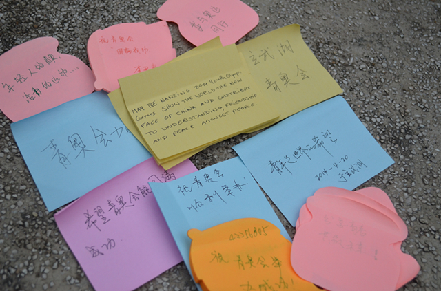 此次“印象玄武湖 助力青奥会”活动由三个子活动组成。活动一“初遇·玄武湖” 要求给所有参与活动的同学纷发特别制作的青奥会贴纸来作为此次活动的标志,随后双方研会主席相互介绍两校文化、学院文化或专业文化,促进共同成长。活动是以小组为单位展开,具体的人员分配完全由抽签决定。每个小组都领取了相应的玄武湖景区图片、小礼品和贴纸、祝福青奥会便签等活动材料。根据比赛要求,每个小组在找到指定的景点之后用手机合影留念,并在相应的景点写下青奥会祝福纸条,在规定的时间内找到的景点越多就获得优胜。活动二“足迹·玄武湖”,在活动一的基础上,要求组员们在寻找景点的过程中向周围的游客宣传青奥会的相关知识,并派发宣传单和特制的祝福纸条,用自己的行动宣传青奥,为青奥做出自己的贡献。在主持人宣布活动开始以后,各组同学分头行动,开始寻找图片指定的景点。大家都兴致高昂地出发寻找景点了。此次活动总共安排有18个景点供大家寻找,在找到相应的景点后,大家迫不及待地向周围的游客们介绍青奥会的相关知识,并与游客们一起合影留念,最后还共同写下了自己对青奥会最真切的祝福。“青年是世界的希望”,一位游客在便签纸上深情地写下这句话,字间饱含对中国青年的殷切期望。一名外国游客愉快地写下对青奥会的良好祝愿,“May the Nanjing 2014 Youth Olympic Games show the world the new face of China and contribute to understanding friendship and peace amongst people”(祝福2014年南京青奥会向世界展示中国的新面貌,增进人们对友谊与和平的理解)。在两个小时过去后,石毛妹、张碧云、包厚望、张万广、李文超5位同学组成的小组获得了这场比赛的第一名。他们在2个小时内找到了图片上列出的所有18个景点。最后在活动三“交流·玄武湖”环节,所有参与活动的同学都被要求聚集在一起,两院主席热情地介绍了各自院系特点,现场同学也积极交流互动,增进了两校间的情谊。