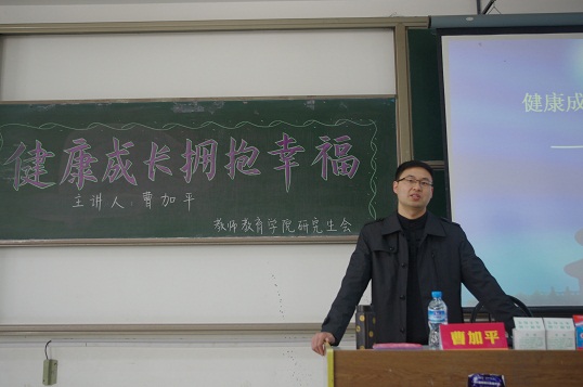2012级研究生心理讲座“健康成长,拥抱幸福”在学正楼501教室隆重举行。此次讲座特邀校心理健康教育咨询中心曹加平老师主讲。出席讲座的还有教师院研究生辅导员王鑫老师。全院近百名研究生欢聚一堂,现场气氛非常活跃。
