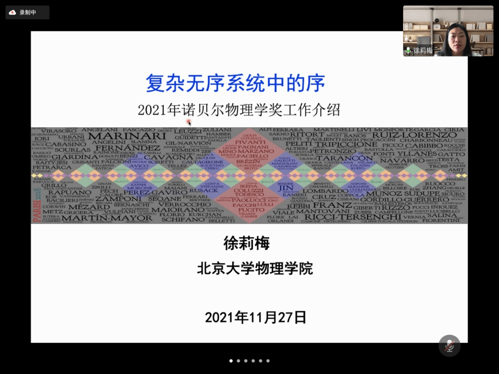 下午的会议主要是两个特邀报告和新一届编委的工作研讨。第一个报告是北京大学博雅特聘教授,物理学院副院长徐莉梅教授做的《复杂无序系统中的序——2021年诺贝尔物理学奖获奖工作介绍》的报告。主要介绍了意大利科学家乔治·帕里西因为“发现了从原子尺度到行星尺度的五力系统中的无序和涨落的相互作用”而获得了诺贝尔物理学奖的工作。最后,中国科学技术大学合肥微尺度物质科学国家实验室副研究员,中国科学技术大学科技传播系副主任袁岚峰做了《量子信息原理与技术》的报告。近年来,量子成为热词,却少有人能真正理解量子。报告从“量子是什么”出发,指出量子信息是量子力学与信息科学的结合;讲述了量子力学的“三大奥义”:叠加、测量、纠缠;介绍了量子计算的原理与成果,并列举了量子通信的例子。报告幽默风趣,通俗易懂,使同学们了解了量子信息的原理与前沿应用,以及该领域内我国在世界范围的领先地位。