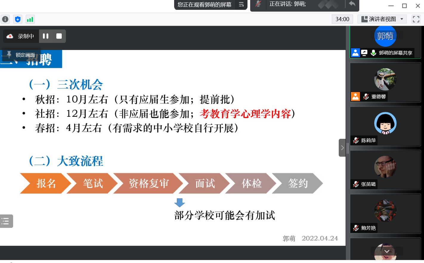 实习方面,郭萌老师分享了自己在南京市第十三中学实习的经历,鼓励大家积极争取上课机会,认真聆听实习导师点评,观摩市级示范课及专家评课,有规划性地完成实习材料的撰写。