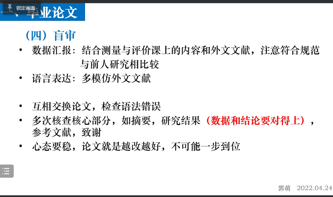 毕业论文方面,郭萌老师提醒大家毕业论文需要注意四个重要的时间节点,分别是6月份的开题、1月份的预答辩、3月份的校级盲审和5月份最终答辩。接着郭萌老师推荐了三个便于文献查证的网站,建议同学们在阅读文献时及时标注重点,做好编号、分类和记录工作,积累地道的英语表达,并注意参考文献格式的严谨规范。关于毕业论文论文盲审,郭老师提出要关注数据汇报、语言表达、语法错误和核心部分的检查。
