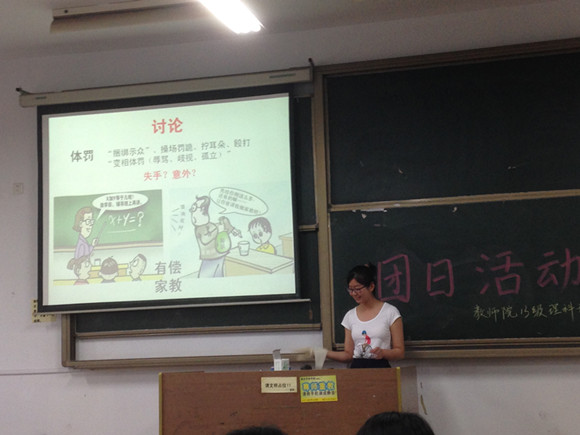 二个环节:职业生涯规划之师德学习。在这一环节,林康立同学先介绍了教师职业道德的内容,然后大家就“体罚”和“有偿家教”展开小组讨论。在讨论过程中,大家畅所欲言,谈了自己的看法,交流自己的思想。