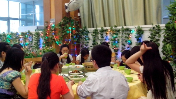 晚上17:00左右,大家陆续来到了餐厅。在开始用餐前,首先班长牛玉凤对这一学期班级里的事情作了总结,然后大家就三五成群地聊起了天:有的同学说了说自己学习的烦恼,有的同学讲讲生活中的趣事,还有的同学则聊起了自己关心的国家大事,现场气氛非常热闹。