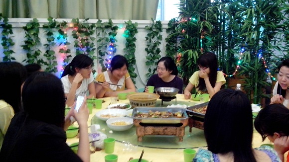过了一会儿,菜肴陆续上桌。大家一边享用美食,一边谈天说地,有些同学还“串门”去敬酒,大家嘻嘻哈哈、打打闹闹,场面十分温馨。饭吃到一半,在一些爱热闹的同学的建议下,大家玩起了“抢7”和“杀人”游戏,输了的同学要接受惩罚:或者吃下红辣椒,或者为大家唱歌跳舞、表演节目。在这几个游戏的推动下,全场的气氛达到了高潮,每个同学都非常开心。