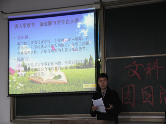本次活动由英语班的张蓉主持,张蓉根据两会代表们关于研究生教育的言论指出社会对研究生的看法不容乐观,并要求同学们就“现在的研究生和以前的中专生没区别”的观点发表自己的看法。同学们踊跃发言,积极陈述自己的观点。整个教室回荡着同学们充满思辨的声音。其中以夏帅波、李亮亮、包莹的观点为代表。夏帅波认为大学扩招,研究生选拔门槛降低导致研究生群体中的人才比例降低,再加上这个时代的研究生生活比上代优越,在吃苦和动手能力方面不敌前人,因而让社会误以为研究生质量下降。李亮亮从就业环境和社会氛围进行驳斥。他认为就业难导致研究生难以找到对口的或技术含量高的工作,使之难以发挥优势。另外,社会浮躁要求新人迅速成熟,但研究生的优势需要一定的时间才能显现,作为偏重理论研究的硕士生也确实难以即刻提高动手能力。包莹则别出新意地借鉴香港研究生教育模式。她认为香港研究生培养模式灵活,实用性、针对性强,方便为社会输送对口人才。其次,香港高校在研究生学术能力、专业素质上把关严格,且以顺利就业为招生前提,这就保证了研究生学有所用,学能胜任。这三位同学的精彩发言赢得了同学们的阵阵掌声,也留给同学们无限思考与启发。