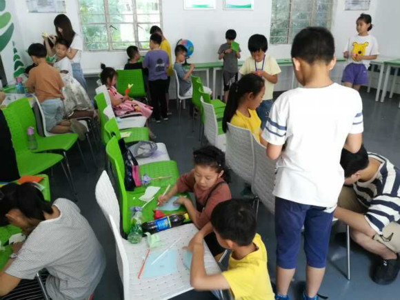 下午第一节课是“折纸传心意”,要求小朋友们根据之前折纸课上学到的,折一朵花,折一个小动物,或是千纸鹤等等,然后自己亲手制作一张贺卡,写上自己想对爸爸妈妈说的话,活动旨在培养学生的动手能力,同时教会小朋友学会感恩。实践小队全体队员深入课堂,悉心指导小朋友们折纸与制作贺卡,小朋友们发挥自己的想象力,折成各种样式,有五颜六色的花朵,有老虎,有青蛙,有千纸鹤,有小船等等,代表不同的寓意,小朋友们还在老师知道下制作各种贺卡,写上对于父母的悄悄话,制作完成之后在结业仪式上献给自己的父母。同时为培养孩子们的自律意识和自觉意识,指导小朋友们制定作息时间表,制作暑假每天的作息安排,制作整个暑假总体安排。