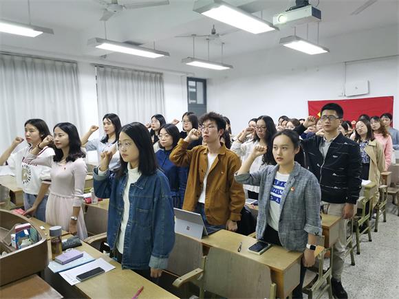 之后,从第二十届研究生支教团归来的刘克家同学向大家分享了他在重庆的支教经历,在艰苦的环境中为山区的孩子们送上温暖。他谈到,教师职业就像在被孩子们包围的海岛中坚守,要用自己最大的力量为教育事业做出自己的贡献。刘克家同学幽默的分享赢得了大家的阵阵掌声,身边平凡人的不平凡事给了大家极大的震撼与鼓舞。活动最后,在书记肖钰敏的带领下,全体支部党员进行了入党宣誓,重温作为共产党员的初心。