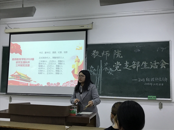 首先,由党支部书记曾海涛总结了自开学以来的党支部工作,学生档案和党员档案归纳整合,撰写党建材料,开展支部委员会,并提出支部活动开展频次和活动内容,党支部暑期社会实践等等,使党支部各党员们了解了支部活动和支部安排,并表示会在今后的支部活动中积极参与,发挥自我的党员榜样作用。接下来,由副书记杜晨曦、宣传委员姜莉、组织委员何建华、纪律委员王娅各自进行自我介绍,方便今后党支部工作委员与党员之间的顺畅沟通与传达合作。