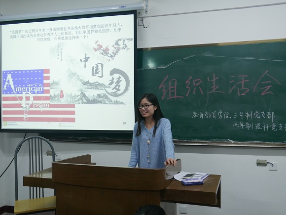 接龙的题目由党支部支委事先命制,其内容含有知识类问题,例如“中美建交以来的中美关系大事记,你知道几个?”,也包含大量主观类问题,如“你怎么看中美‘新型大国关系’,谈谈你的理解”,当然也有一些让大家畅所欲言的问题如“2016年为中美旅游年,抛开现实因素,你最想去哪旅游?”。这些问题让大家在收获知识的同时尽可能地独立思考提出观点,许多支部同学在回答问题时思路清晰观点鲜明,如针对食品安全中转基因食品问题,三年制支部蒋晨康同学根据自身的学科性质给出了自己独到的见解。整个生活会期间不仅有精彩的演讲和论证,更有的用歌唱、朗诵来表达情感,同学们精彩纷呈的表现让支部的第一次组织生活会高潮迭起。