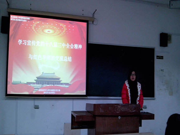 在学习完党的十八届三中全会精神之后,由党员们自由发表自己对这次重要会议的看法。先后有数学专业的王东帅、地理专业的郭志威、物理专业的许大地等党员发表了自己的看法。主要观点是关于房地产市场与土地改革等民生问题,其中地理专业的郭志威还从他的专业角度提出了关于生态和人口方面的看法。大家踊跃发言表现积极。