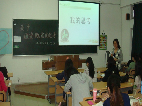 2013年5月7日星期二18:00,教师院研究生第三党支部在学明楼215展开了以“关于雅安地震的思考”为主题的组织生活,同学们纷纷发表了自己对于雅安地震的看法。