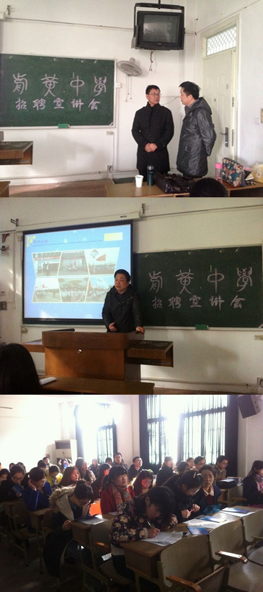 前黄中学的副校长先在203教室展开了宣讲会,随后将众多求职者按学科分散到两个教室,逐一与其展开交流并筛选简历。此会伊始,前黄中学的领导播放了前黄中学校庆视频,使研究生们对前黄有个直观的了解。随后,领导们在前黄的师资力量,发展前景,学校成绩,治学理念,福利待遇等方面展开了详细的介绍。前黄中学的领导十分重视在南师大的教师招聘,鼓励各专业的优秀研究生踊跃报考。其重视还体现在筛选简历的过程,各学科负责人与每位报考者展开了亲切、详细的交流,期间,负责人不断地在求职者的简历上做标注,并耐心回答研究生们的各种问题。