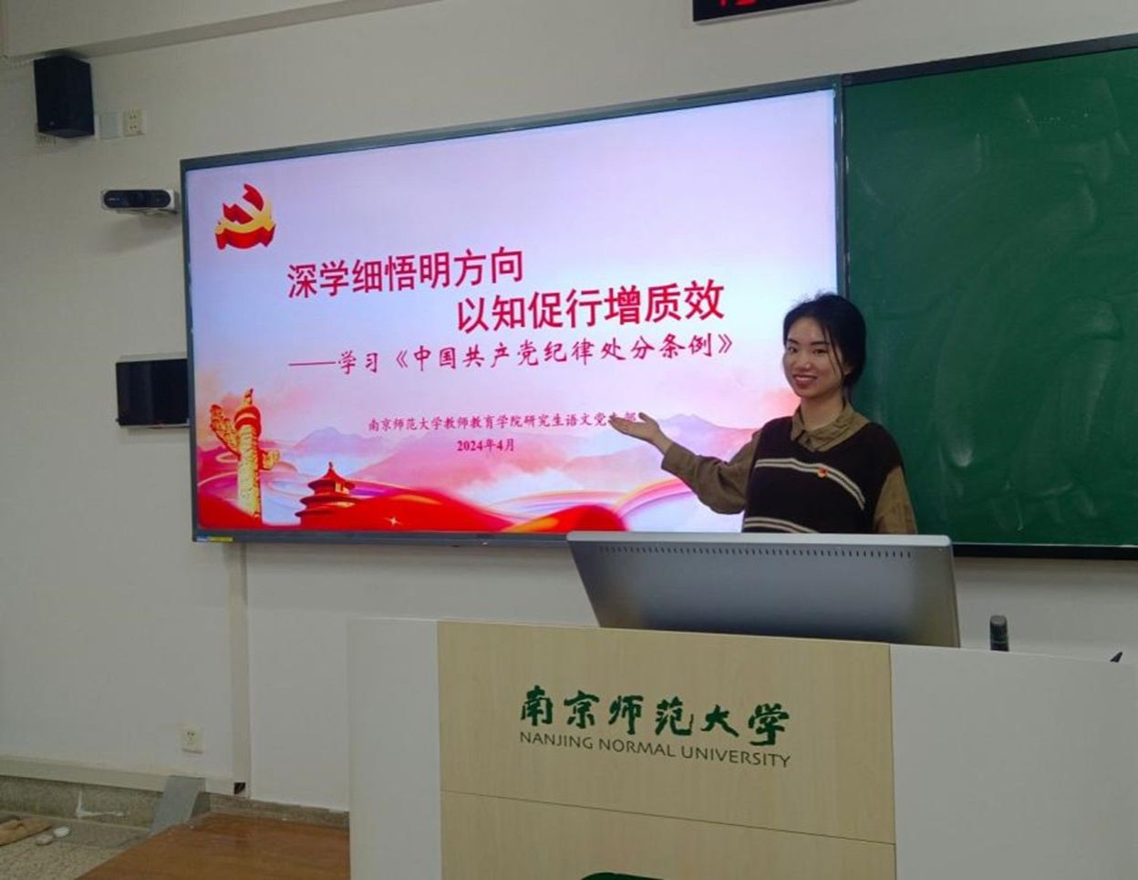 史政研究生党支部徐怡佳同志在发言中,以个人在班级组织中的任职为例,明晰了自己的义务和责任,作出坚决反对形式主义、强化组织意识的庄严表态。语文研究生党支部孙宁馨在发言中表示,经过此次学习,我不仅对党的纪律有了更为清晰的认识,也更加明确了自己作为一名学生党员的责任与担当。物化研究生党支部张春晓同志深刻感受到《条例》对于党员行为规范的重要性,她认为《条例》不仅是党员行为的“紧箍咒”,更是我们保持初心、忠诚履职的“指南针”。每一个条款、每一项规定,都凝聚着党的智慧和期望,是对党员行为的严格要求和规范。数学研究生党支部薛凯同志表示,在深入学习了《中国共产党纪律处分条例》后,对于如何做一名合格的党员有了更深刻的理解。党的纪律是党的生命线,也是党的事业发展的根本保障。将遵守党的纪律和规矩,发挥党员的先锋模范作用,为学校的发展和社会的进步贡献自己的力量。