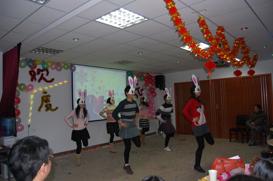 晚会结束,兔子舞再次响起,六只可爱的小兔子和在场所有师生一起欢快的起舞,围成了一个又大又圆的圈,预告着2009年的圆满结束,更期待着2010年更加辉煌灿烂的未来。