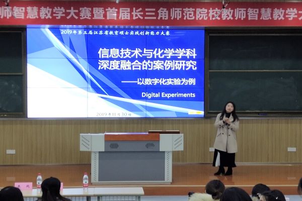第四位是荣获特等奖学科教学化学项佳敏。项佳敏学姐的微课题是一个“信息技术与化学学科深度融合的案例研究”,以数字化实验为例,通过50个案例的分析,总结了信息技术与化学学科深度融合的特点和不足,就“数字化实验融入化学教学”的目的,教学策略,应用等建议。而学姐的微教学“离子反应发生的条件”则始终围绕着“看到离子”建构学生的新认知。