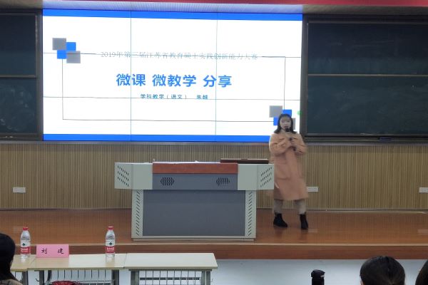 第二位是荣获特等奖学科教学语文朱越。朱越学姐首先补充了大赛的考核目标、方式、展示内容等要求,然后“以《红楼梦》阅读教学为例”介绍了自己的微课题,从“语文核心素养”和“整本书阅读”的界定分析入手,从理论到实践再回到理论,总结了目标、活动、评价三个层面设计的路径。之后,学姐又展示了自己的微教学《六国论》的教学思路和过程,重点就“论”进行了阐释。