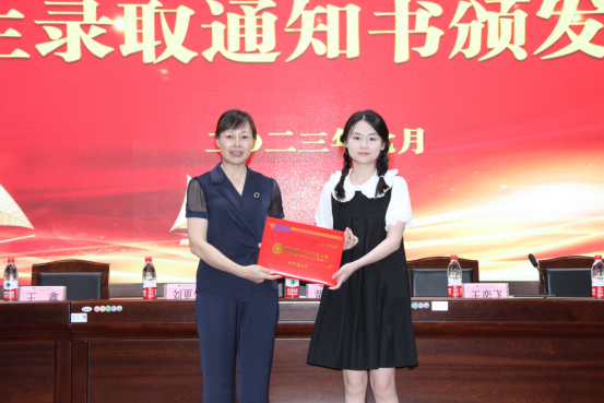 党委书记黄菊香向前黄高级中学副校长王波赠送新生录取喜报。