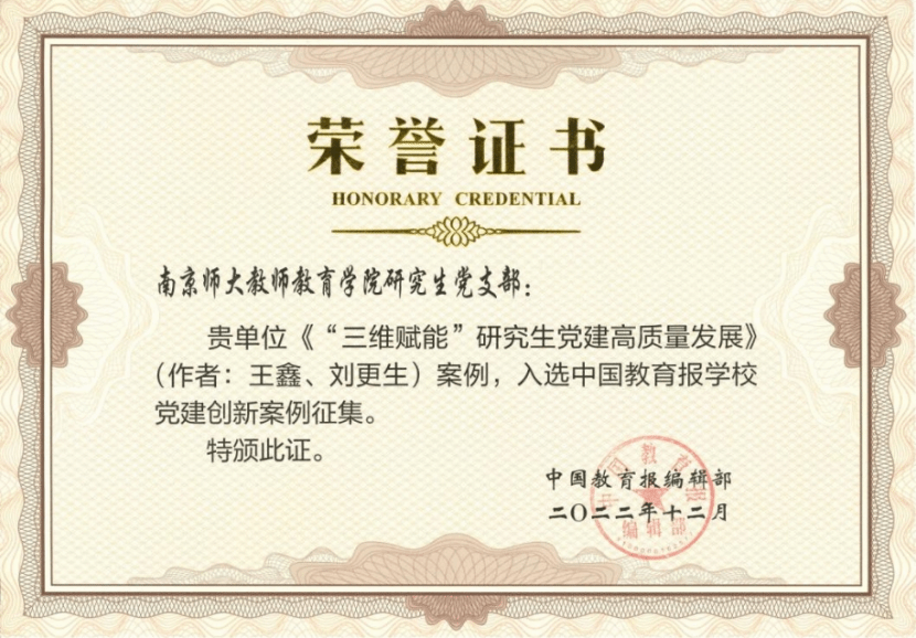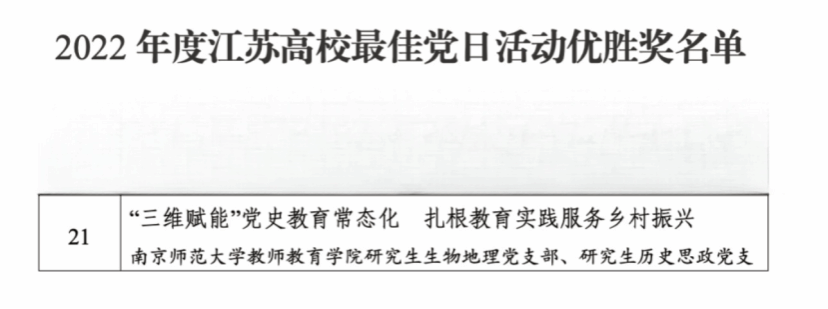 研究生党支部结合师范特色,着力开展“‘三维赋能’党史教育常态化,扎根教育实践服务乡村振兴”为主题的党日活动,党员参与率达100%,充分发挥教育服务乡村振兴功能,获评2022年度江苏高校最佳党日活动优胜奖。