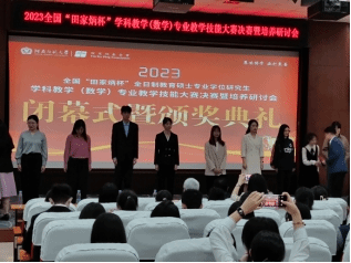 等全国104所高校的472名选手参加,初赛采用线上形式进行,包含教学设计与教学视频两部分。通过专家评审,有97所高校的236名选手入围决赛,决赛由现场备课(90分钟)、现场授课(10分钟)和答辩(5分钟)三部分组成。决赛共评选出一等奖24名,二等奖48名,三等奖73名,优秀教学设计奖89名。我校2022级学科教学(数学)专业汤庆君同学获得一等奖、刘镱同学获得二等奖、邱悦同学获得三等奖、徐娅同学获得优秀教学设计奖。