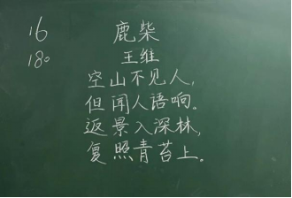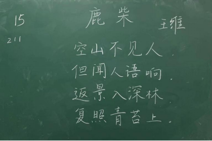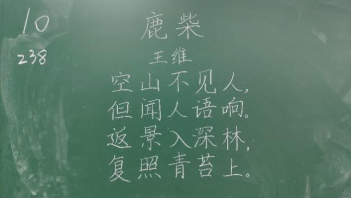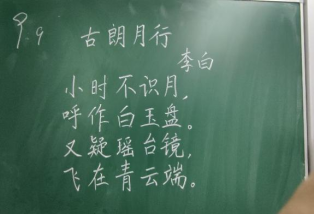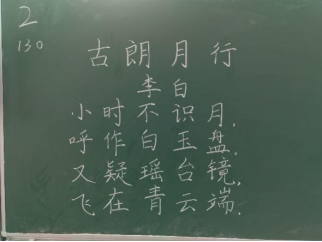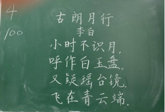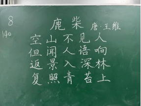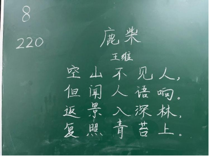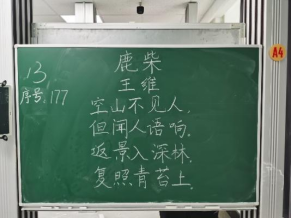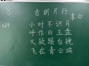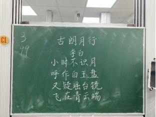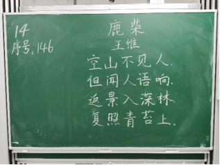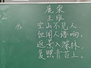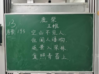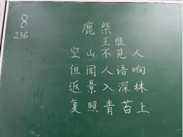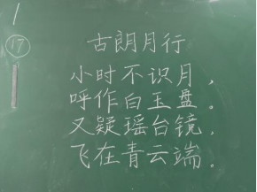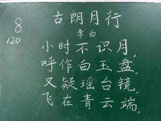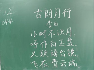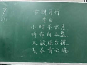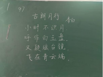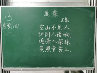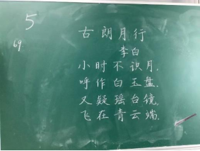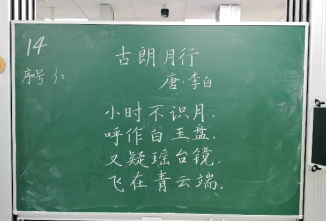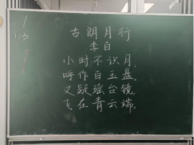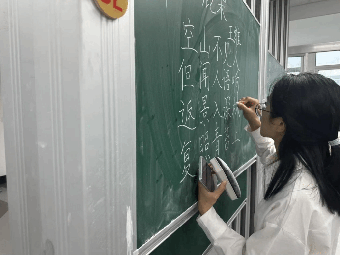 比赛过程中,同学们根据提供的统一书写内容,仔细斟酌作品的结构和布局,把握字与字之间的大小、距离关系,在黑板上全神贯注、有条不紊地进行书写,尽情施展自己的才华。比赛分为上午场、下午场,书写内容分别为《古朗月行》与《鹿柴》。