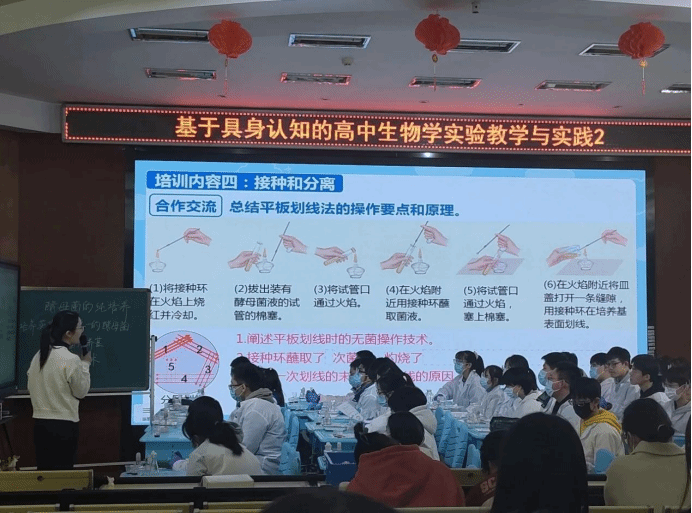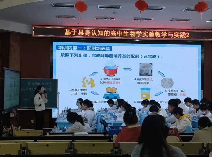 南京市玄武高级中学杨淑娴老师开设《酵母菌的纯培养》的公开课。杨淑娴老师以品尝葡萄酒作为课堂导入,创设了“酵母菌种培育工”岗前培训的课堂大情境,通过呈现图表、视频等形式,引导学生对配制培养基、灭菌、倒平板、接种与分离以及纯化培养等酵母菌培养的实验过程进行梳理,并明确各个实验环节的操作内容与注意要点。随后组织学生以小组为单位动手操作倒平板与平板划线这两个步骤,以加深学生对实验步骤与控制无菌条件的认识。杨淑娴老师的课堂围绕酵母菌培养的主题内容,以“酵母菌种培育工”岗前培训的情境贯穿整堂教学,不仅帮助学生巩固了菌种培养的内容知识,更是促进了学生对微生物菌种培育工程师等与生物学相关的职业的认识与了解,为学生后续开展自身职业规划奠定了良好的基础。