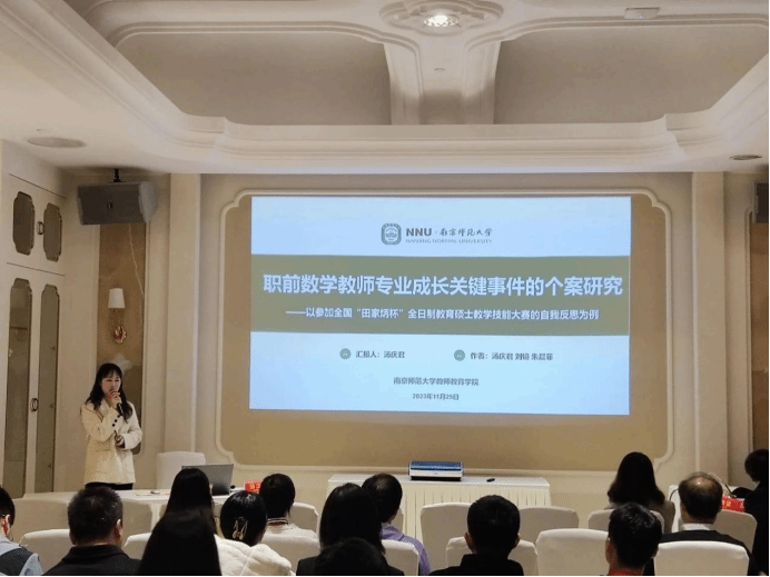 在分论坛汇报中,2022级研究生汤庆君开展了题为《职前数学教师专业成长关键事件的个案研究——以参加全国“田家炳杯”全日制教育硕士教学技能大赛的自我反思为例》的汇报。