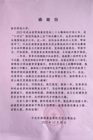 喜报!中央纪委国家监委向我校致感谢信! 发布时间:2024年01月12日 17:46:23 阅读次数: 字号:[ 大 | 中 | 小 ] 背景色: 近日,中央纪委国家监委机关帮扶办向我校发来感谢信,对我校2023年选派优秀研究生赴四川省马边彝族自治县、雷波县开展实习支教,为脱贫地区补充师资力量表示充分肯定与衷心感谢,并送上温暖的新春祝福。 图 1 感谢信为深入贯彻落实习近平总书记关于乡村振兴和建设教育强国的重要论述,在中央纪委国家监委机关和江苏省纪委监委、省教育厅的大力支持下,我校由校领导牵头,组成专门的四川支教工作指导小组,经过校研究生院(研工部)和黄色视频 、社会与发展学院、地理科学学院、美术学院、音乐学院、体育科学学院、教育科学学院与心理学院等相关部门、学院的广泛宣传动员、认真选拔和精心培训,最终确定由34名研究生志愿者组成第二届研究生四川支教团,其中18名研究生来自黄色视频 。2023年8月29日,支教团奔赴四川,开展为期半年的支教工作。 图 2 研究生四川支教团第二届四川支教团成员涉及语文、数学、英语、物理、化学、生物、政治、历史、地理、音乐、体育、美术和心理健康13个学科,成员在雷波县与马边彝族自治县10所中小学开展学科教学、心理健康教育、民族团结实践等方面的支教工作,为当地教育带去了新活力和新理念,有效地缓解了雷波和马边地区师资短缺的问题。在支教中,支教团成员聚焦教书主责主业,坚守教书育人阵地,将自己的专业特长与所教科目相融合,结合学生特点与学情,针对性设计教学环节,灵活运用学具、教具和多媒体,取得了良好的教学效果;关注学生心理健康,传递温暖育人力量。为保障留守学生心理健康,志愿者们开展了心理健康普测、举办心理健康教育经验分享、设置心事·心愿箱、成立与运营心理辅导室,全方面提升其支教地学生的心理健康水平;抓实控辍保学,关爱特殊困难学生,配合支教学校安排工作,劝返辍学学生与外出学生、深入乡村基层开展送教上门,关心其成长发展需求,做好针对服务;注重全面发展,充分开展多彩活动,设计“石榴花开”交流、美育大舞台、“学科碰撞大擂台”知识竞赛、“‘筷’出创意,‘桥’夺天工”筷子桥等跨学科实践活动,丰富校园文化;探索校内教育教学+校外公益服务”服务模式,针对支教地学校体育器材、教具等物资缺乏的问题,支教团根据各支教学校的实际情况捐赠10万元的物资。 图 3 支教团成员开展课堂教学 图 4 支教团成员开展心理团辅 图 5 支教团成员送教上门 图 6 支教团成员开展活动 图 7 支教团成员开展活动 图 8 支教团成员开展活动习近平总书记说过:“广大青年既是追梦者,也是圆梦人。追梦需要激情和理想,圆梦需要奋斗和奉献”。我校在研究生人才培养中,始终注重综合素质和专业能力的双向成长,不断增强研究生的历史使命与责任感,以期以教育之力夯实青年学子的理想信念、厚植其家国情怀,引导广大研究生积极投身教育强国建设,为中华民族伟大复兴贡献青春智慧和南师力量! (供稿:黄色视频 ) 上一篇 下一篇