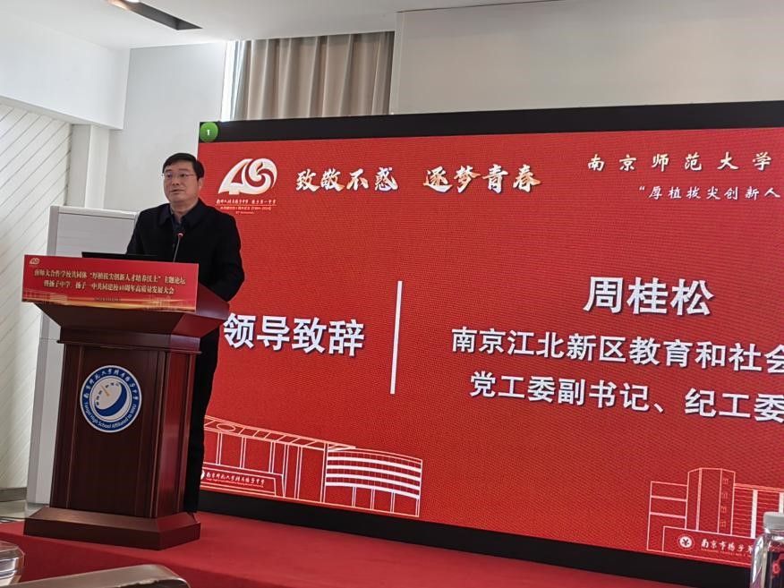 会议伊始,由南京江北新区教育和社会保障党工委副书记、纪工委书记周桂松致欢迎词。周书记对各位领导的莅临表示衷心感谢,并结合南京江北新区近十年的经济、教育发展历程,表达了对拔尖创新人才的关注,强调学校应加强深度合作、资源共享,共同探索人才培养的新模式。