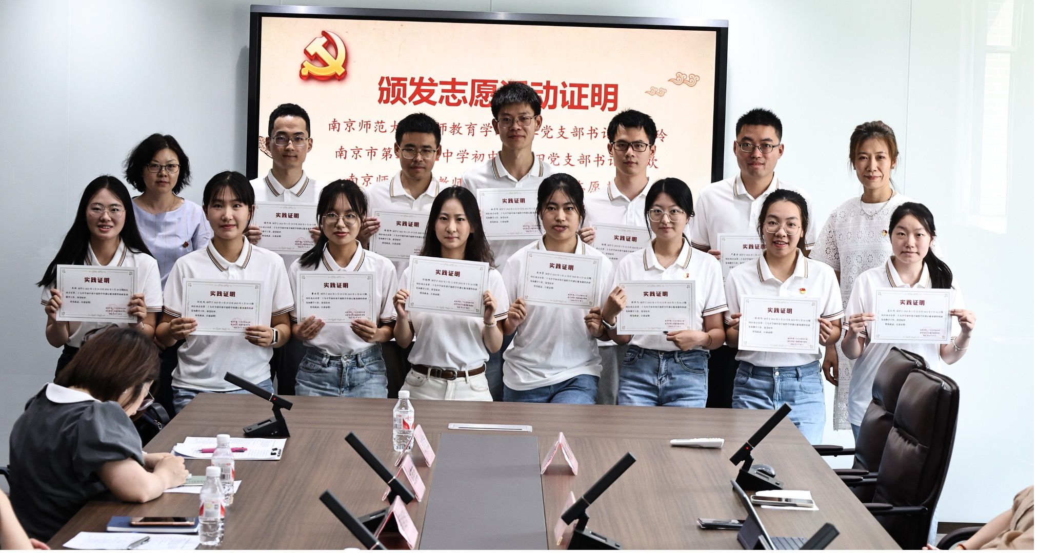 教工第二党支部书记顾继玲教授和南京市第二十九中学初中部第四党支部书记周欢老师为参加“SCOPE境界”跨学科教学项目的研究生代表颁发实践活动证明。