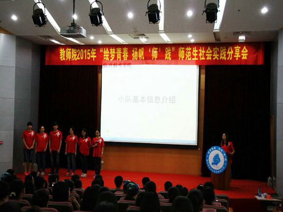 积极开展了“师译暑假,为你写师”暑期社会实践活动。在本次暑期社会实践中,教师院共组队130支,其中校级重点团队共14支,本科生暑期社会实践参与率达100%,院、校两级领导也积极指导暑期社会实践的开展。实践足迹遍布苏州、常州、贵州、福建等多地,同学们播撒下了青春的热血,更收获了累累的硕果。在分享会上,11支在本次暑期社会实践中表现优异的小队向学弟学妹们进行了展示,希望以模范的力量影响和鼓励15级新生在以后的社会实践中再创佳绩,并引领学生树立和践行社会主义核心价值观。