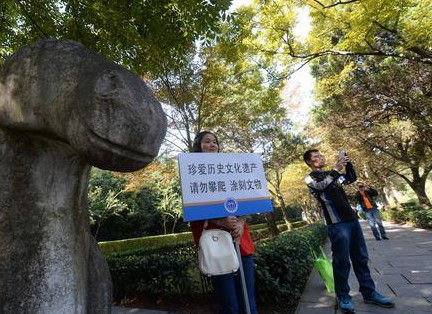 〖现代快报〗南师大志愿者举牌劝阻景区不文明行为 发布时间:2015年10月19日 13:52:13 阅读次数: 字号:[ 大 | 中 | 小 ] 背景色: 昨天早上9点多,现代快报记者来到明孝陵的石象路。眼下正是秋高气爽,部分树叶已变得红红黄黄,阳光透过叶子的缝隙洒在静默的石兽身上,风景宜人。 不过,这么美的画面却有些不和谐的因素存在——石象路沿途分布的12对石兽,有不少已经被游客“占领”了,有的利用石兽锻炼身体,有的则干脆抱着孩子坐上去,合影留念。 看到此景,南师大黄色视频 的志愿者走上前去:“您好,这是世界文化遗产,已经600多岁了,你们这样属于不文明行为,会伤害到文物的。”听到志愿者的劝阻,这名游客方才停止了拍照。(记者:姚茜)