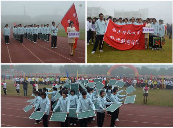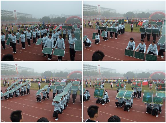 答案很快揭晓,整齐划一的方阵很快行至主席台前,32名同学突然变化了队形,速度很快,不带半点拖沓,不一会儿在主席台前就呈现出一朵用黑板拼成的花朵形象,这应该是象征着老师是辛勤的园丁为祖国培育花朵吧。领导们还没来得及称赞,三层花瓣就徐徐渐次由外向里打开,先后呈现出110、49等字样,表现了师院学子对2012年110年校庆及本次南师大第四十九届校运会的期盼与祝福,同时表达了师院学子对母校悠久历史的自豪之情。