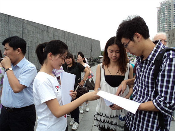今年正值建党90周年,到这两个地方来参观和悼念的市民和游客络绎不绝。社会实践团成员分别参观了侵华日军南京大屠杀遇难同胞纪念馆,瞻仰了人民英雄纪念碑,从中他们了解了相关史实,学习到了很多历史知识,亲身接受了爱国教育。除此之外,他们还发放爱国教育基地调查问卷,邀请游客参与调查。本调查受到了市民与游客的支持与赞同。游客们表示,在历史面前,他们感到了一份肃穆,一份凝重,更感到了一种责任,作为一名中国人,应当铭记历史,勿忘国耻,以史为鉴,建设更加美好的中国。