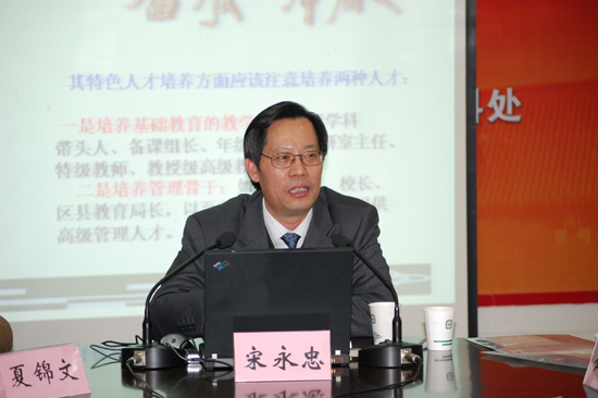 校长宋永忠教授作题为《关于教师教育的一些思考》的主题报告。宋校长根据自己多年对教师教育研究所获得的成果,纵论我国教师教育改革大局,分别从教师教育面临新的发展机遇和挑战、教师教育在我国的定位、教师教育的体制发展、师范大学如何打造教师教育特色和相关政策等五个方面阐述了我国教师教育改革的走向。