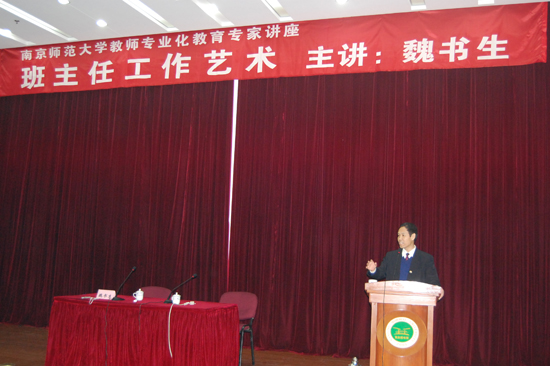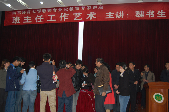 在报告中,魏书生老师向同学们介绍了其多年的班主任工作经验,提出班主任首先要具有民主的思想,即树立为学生服务的意识,建立互动的师生关系,发展学生的人性和个性,他还特别强调作为班主任尤其要在决策过程中做到民主。其次,班主任还要具有科学的理念,要建立计划系统、监督检查系统和总结反馈系统,从而保证班主任工作的质量,提高班主任工作的效率。魏书生老师认为班主任之道即为人之道,将对班主任角色的理解提高到做人的高度。在场的同学们纷纷表示很受启发。