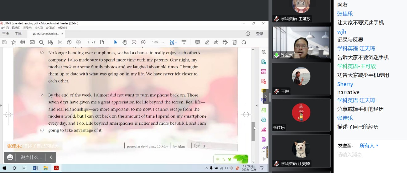 系统功能语言学与教学息息相关,而语篇分析是做好基础英语教学的前提条件。系统功能语言学在语篇分析中可以发挥重要作用。讲座中,许老师带领同学们详细分析了两个语篇。在语篇分析的过程中,以新译林版高中英语教材必修三第三单元Extended Reading板块Smartphone: a smart choice?为例,许老师结合语篇的体裁(genre)、语域(register)、语场(field)、语旨(tenor)、语式(mode)等维度,就如何进行语篇分析进行了有效示范、讨论和交流。