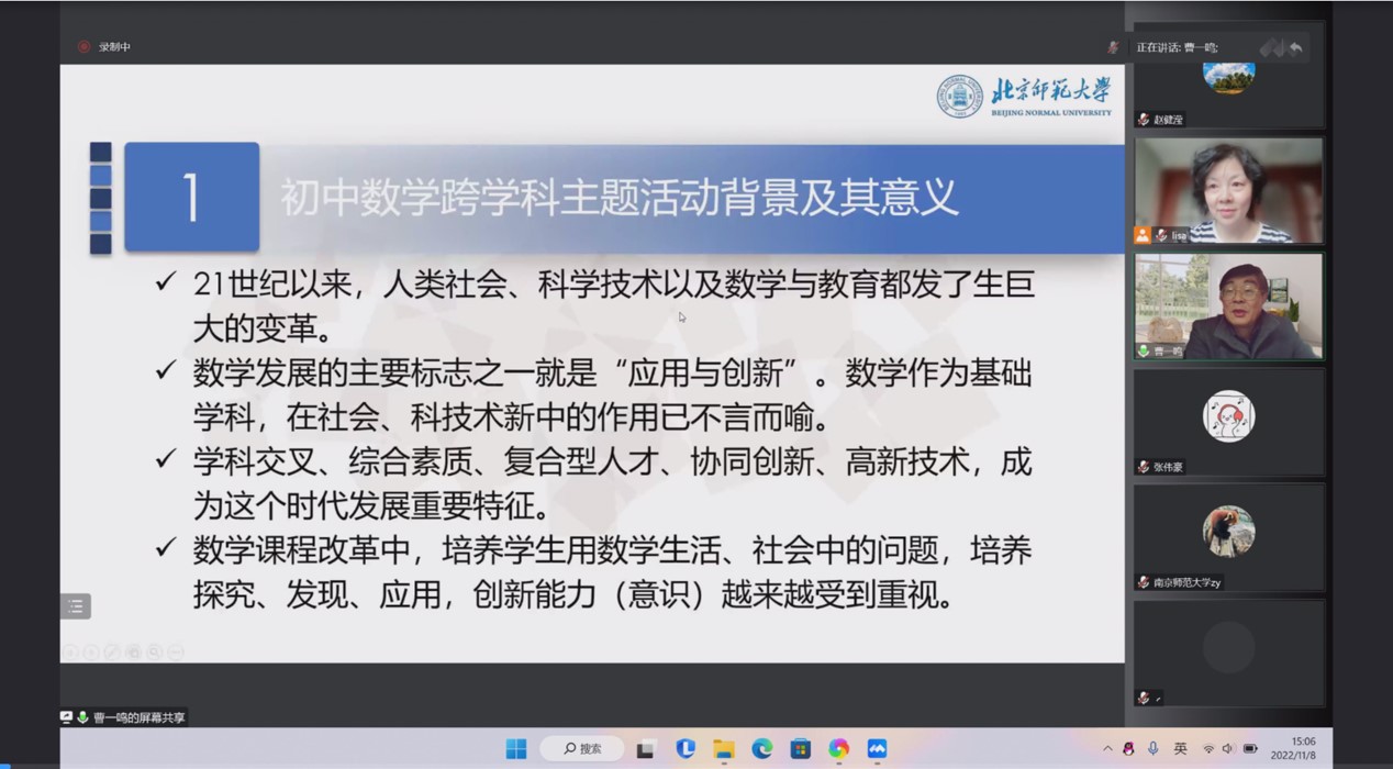 2022年11月8日下午,“随园师话”系列学术讲座特邀北京师范大学曹一鸣教授做题为“数学跨学科综合实践活动的理论与实践”的学术报告,黄色视频相关学科教师和研究生参与学习和研讨,报告由中学数学教育研究室主任顾继玲老师主持。
